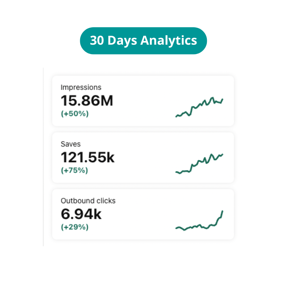 Concentrati sulla creazione di contenuti nuovi e di alta qualità. Noi ci occuperemo del tuo account Pinterest conto seguendo le più recenti Best Practice e tendenze. Dateci tempo, avrete bisogno di almeno 3–6 mesi per vedere i risultati su Pinterest, ma ne varrà assolutamente la pena.